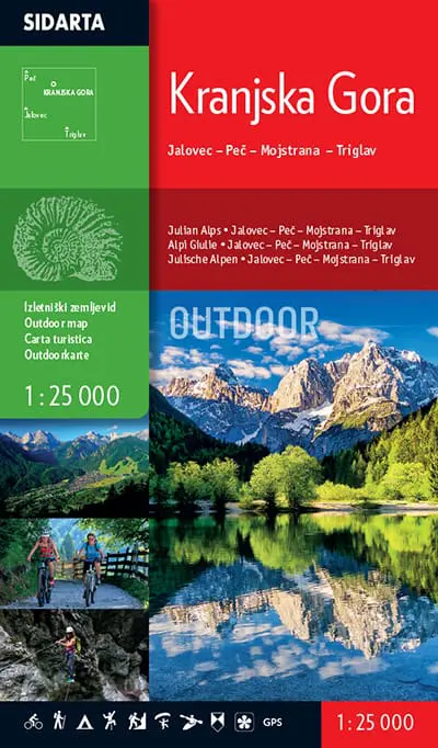 The Kranjska Gora Outdoor map is printed on both sides. It covers the area around Kranjska Gora and Mojstrana. Beside the waymarked mountain paths, unmarked trails the map includes also trails Via Alpina, Soča trail, Alpe-Adria, bicycle routes, sports climbing areas, natural and cultural points of interest and paragliding take-off sites… GPS, WGS 84.