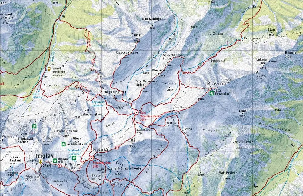 The Triglav map covers the central region of of the Julian Alps. Beside the waymarked paths, unmarked trails and ski tours the map includes also: sports climbing areas, natural and cultural points of interest and paragliding take-off sites. GPS, WGS 84.