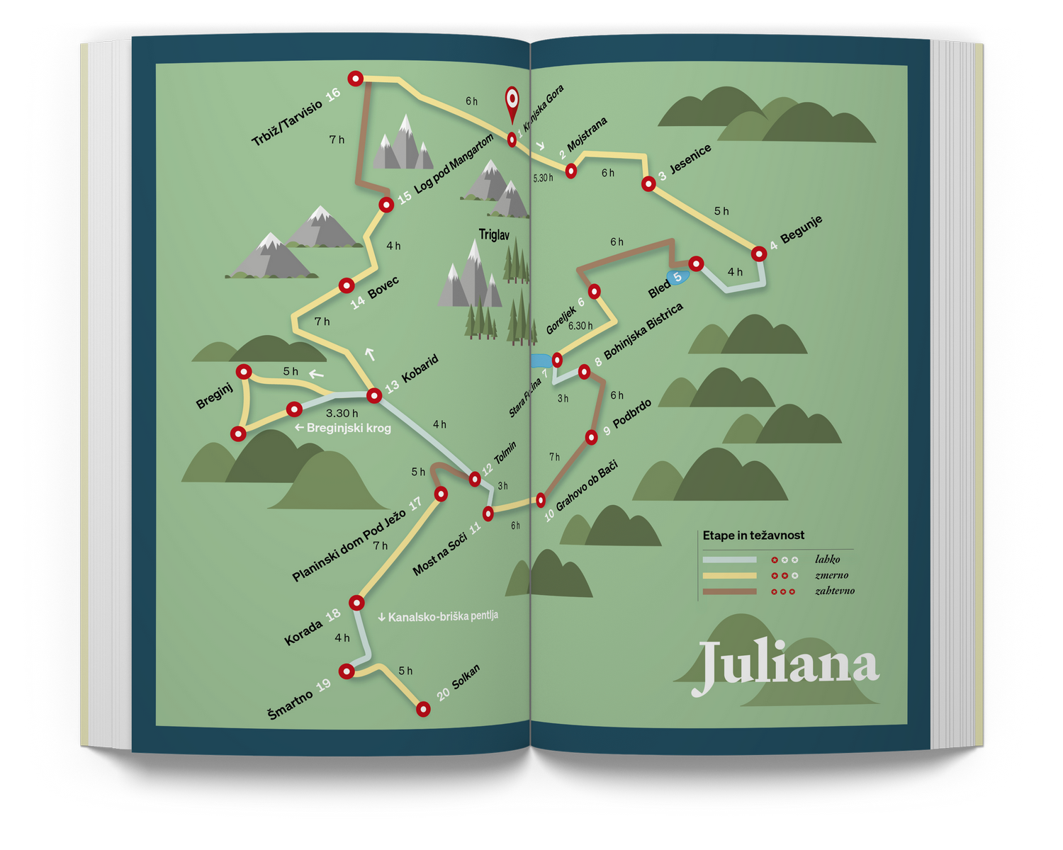 Juliana Trail je 270 kilometrov dolga pohodniška pot, ki objame celoten vzhodni del Julijskih Alp. Na njej se ne bomo povzpeli na Triglav ali druge vrhove, ampak ga bomo obkrožili po alpskih dolinah, ob rekah in jezerih, skozi gozdove in čez prelaze. Hodili bomo izven glavnih turističnih tokov, ob pristnih doživetjih spoznavali raznolikost in izjemnost naših gora.