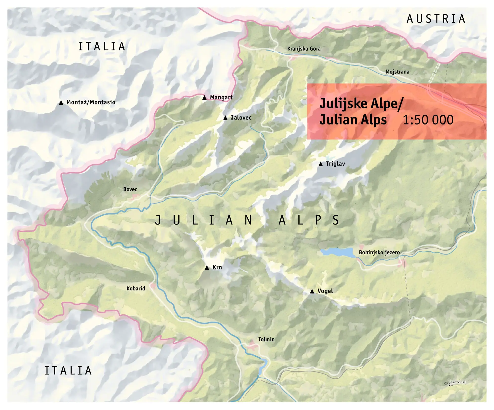 Karta zajema celotne Julijske Alpe. Vzhodna meja poteka v smeri Bled-Ratitovec-Blegoš, južna Matajur-Tolmin-Porezen, zahodna Breški Jalovec-Brda ter severna Trbiž-Tromeja-Kepa-Dovška Baba. Vključuje tudi prvaka Zahodnih Julijcev, Viš in Montaž.