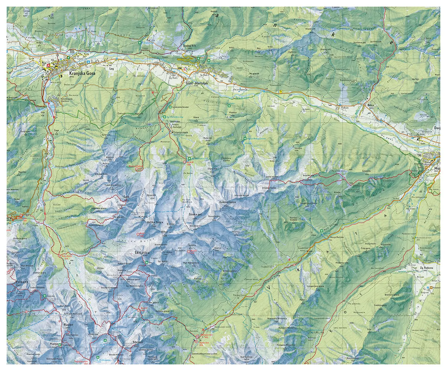 – vse markirane poti na področju Julijskih Alp, kategorizirane po težavnosti na nezahtevne, zahtevne in zelo zahtevne markirane poti;