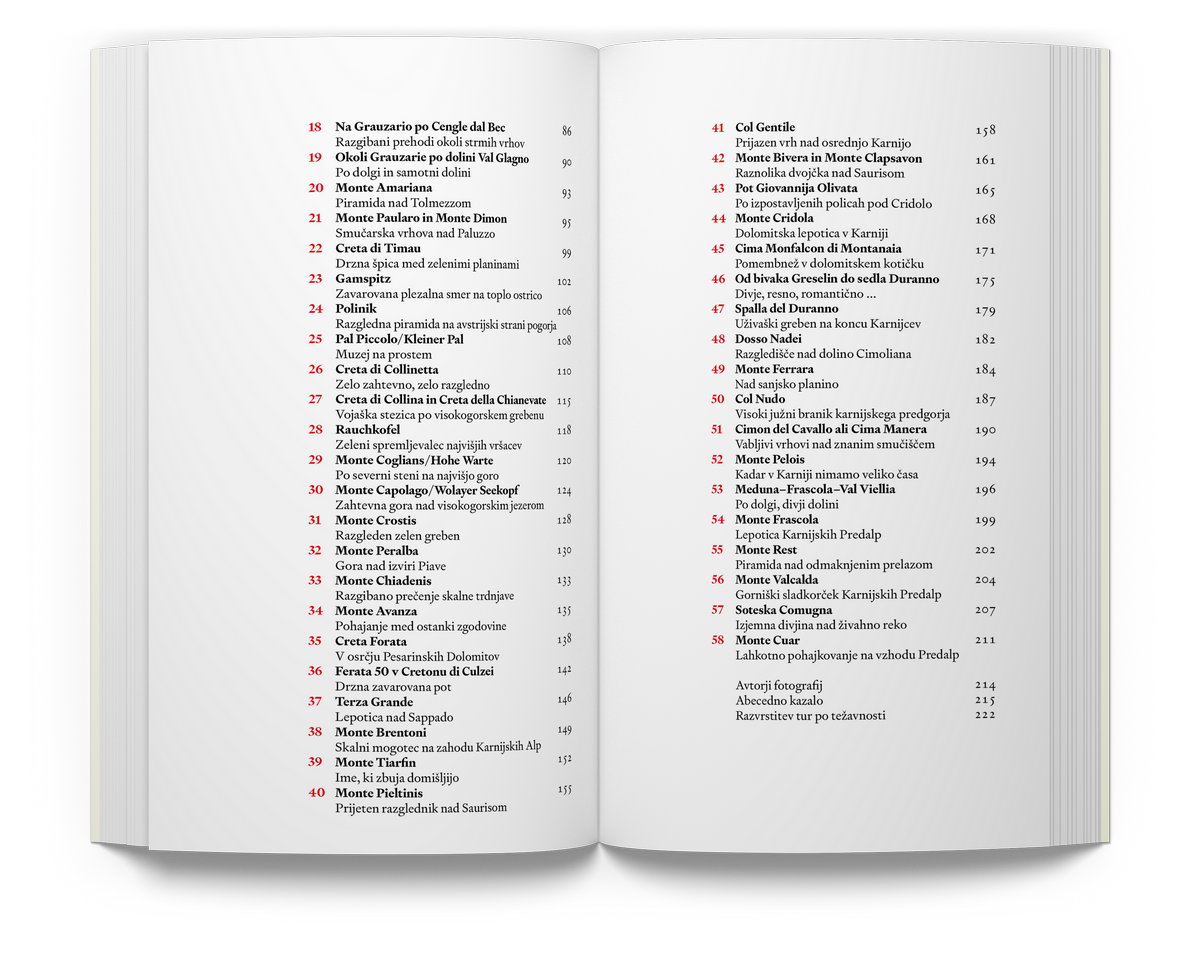 V drugi, temeljito posodobljeni izdaji je predstavljenih 58 obiska vrednih ciljev, ki po težavnosti segajo od lažjih popoldanskih izletov do zahtevnih brezpotij in lažjih plezalnih tur.