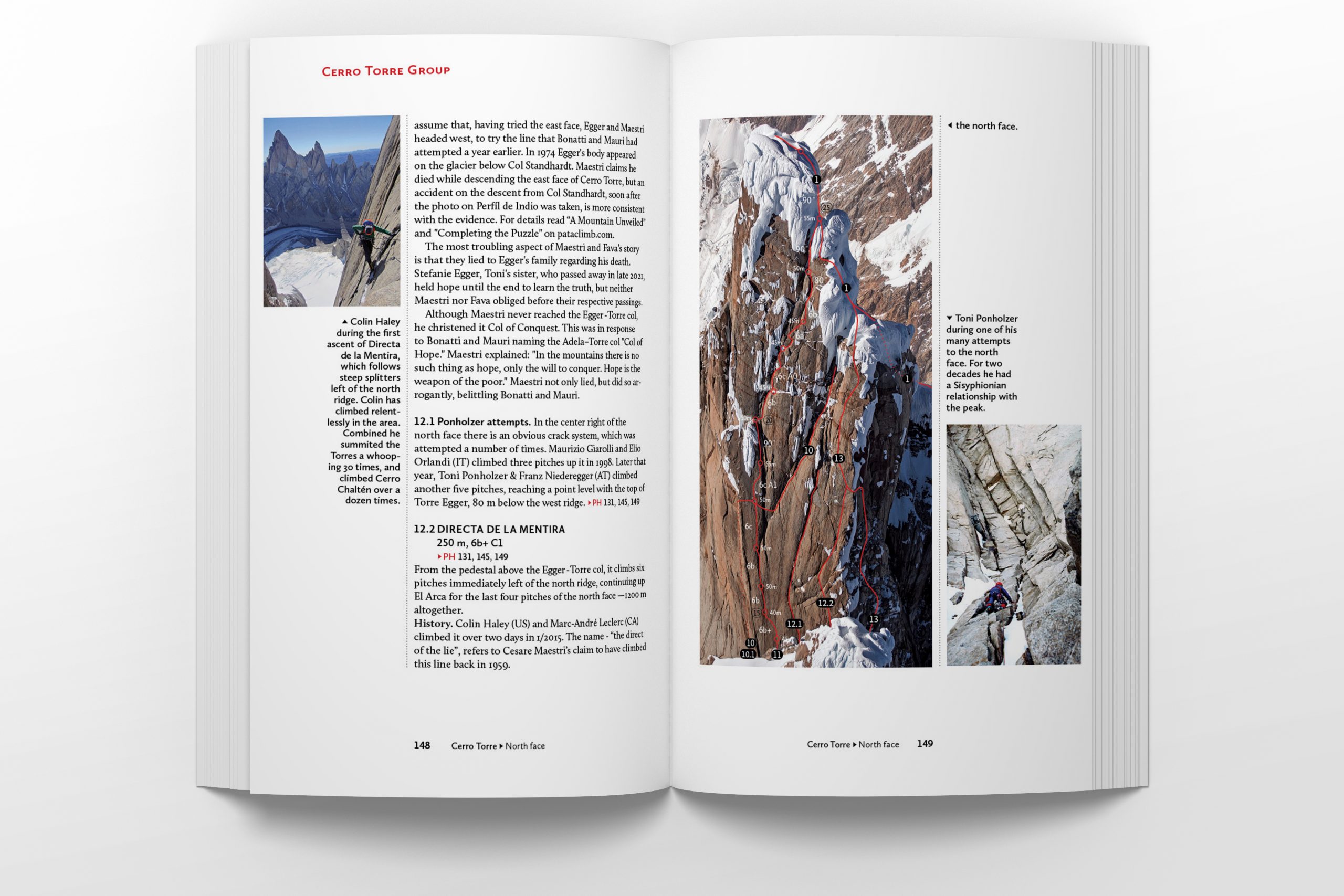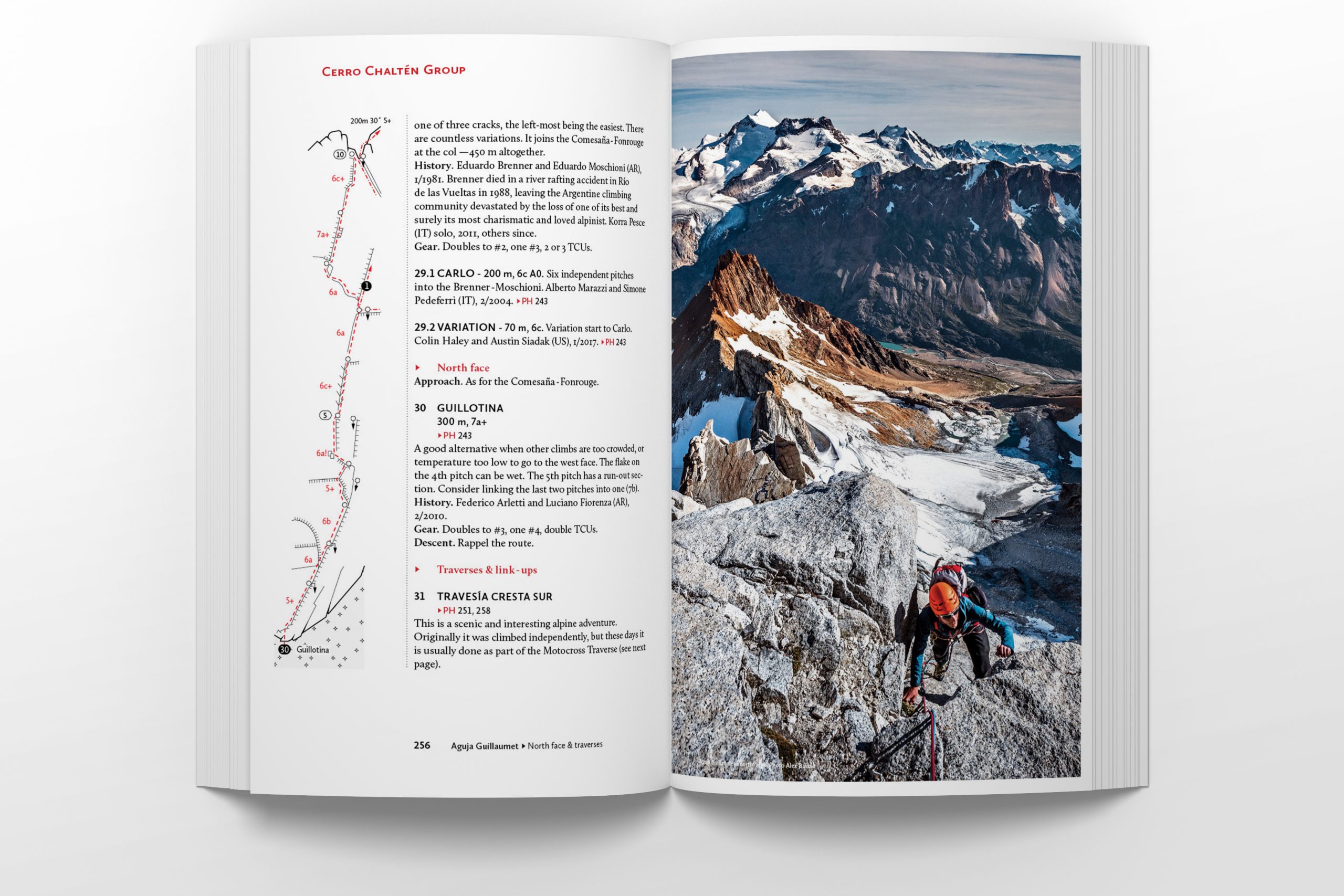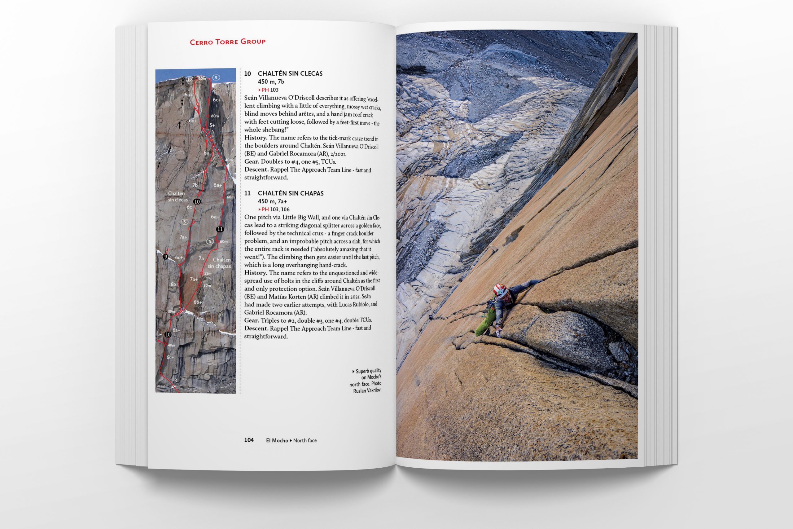 Na skrajnem jugu argentinske Patagonije se vzdolž meje s Čilom dviga veličastna veriga gora najdrznejših oblik. V množici granitnih stebrov in sten ter v led vkovanih vrhov izstopata slovita Cerro Torre in Cerro Fitz Roy. Zaradi zanesljivih vremenskih podatkov, ki v zadnjih letih omogočajo precej natančno napoved vremena, se je način plezanja v Patagoniji korenito spremenil. Kljub obilici slabega vremena dobro pripravljene in informirane naveze lahko izkoristijo tudi najkrajša obdobja lepega vremena. Pri načrtovanju uspešnega vzpona, ki ga je treba prilagoditi pričakovanemu obdobju lepega oziroma za plezanje primernega vremena, je poleg poznavanja smeri ključnega pomena logistika dostopa, sestopa in morebitnega umika. Vse to in še veliko več prinaša 3. izdaja kompletnega alpinističnega vodnika po gorah nad Chaltenom, ki ga je avtor Rolando Garibotti označil za svoje življenjsko delo. Poleg natančnih skic, vrisov in opisov smeri so pri večini vzponov navedeni tudi priporočljivi dostopi in sestopi ter potrebna plezalna oprema in strategija vzpona. Kot eden najboljših poznavalcev teh gora s 30-letnim plezalskim stažem je vodnik obogatil z izčrpnim zgodovinskim orisom področja in plezanja ter koristnimi splošnimi informacijami. Naravnost osupljivo je, koliko kvalitetnih smeri ponujajo gore nad Chaltenom in kako močan pečat so v teh stenah pustili tudi slovenski plezalci. V vodniku so dokumentirani vsi pomembnejši vzponi slovenskih alpinistov.